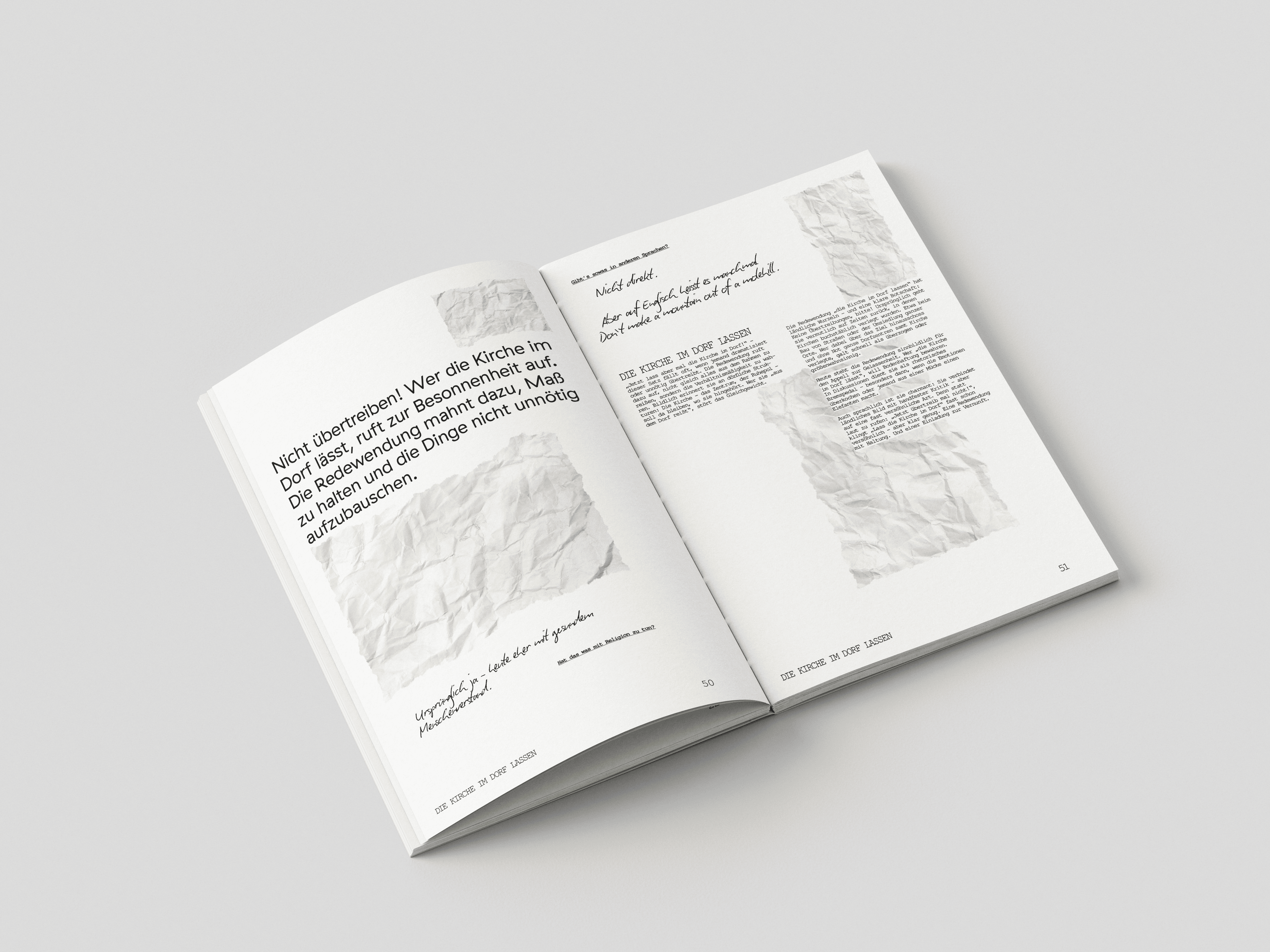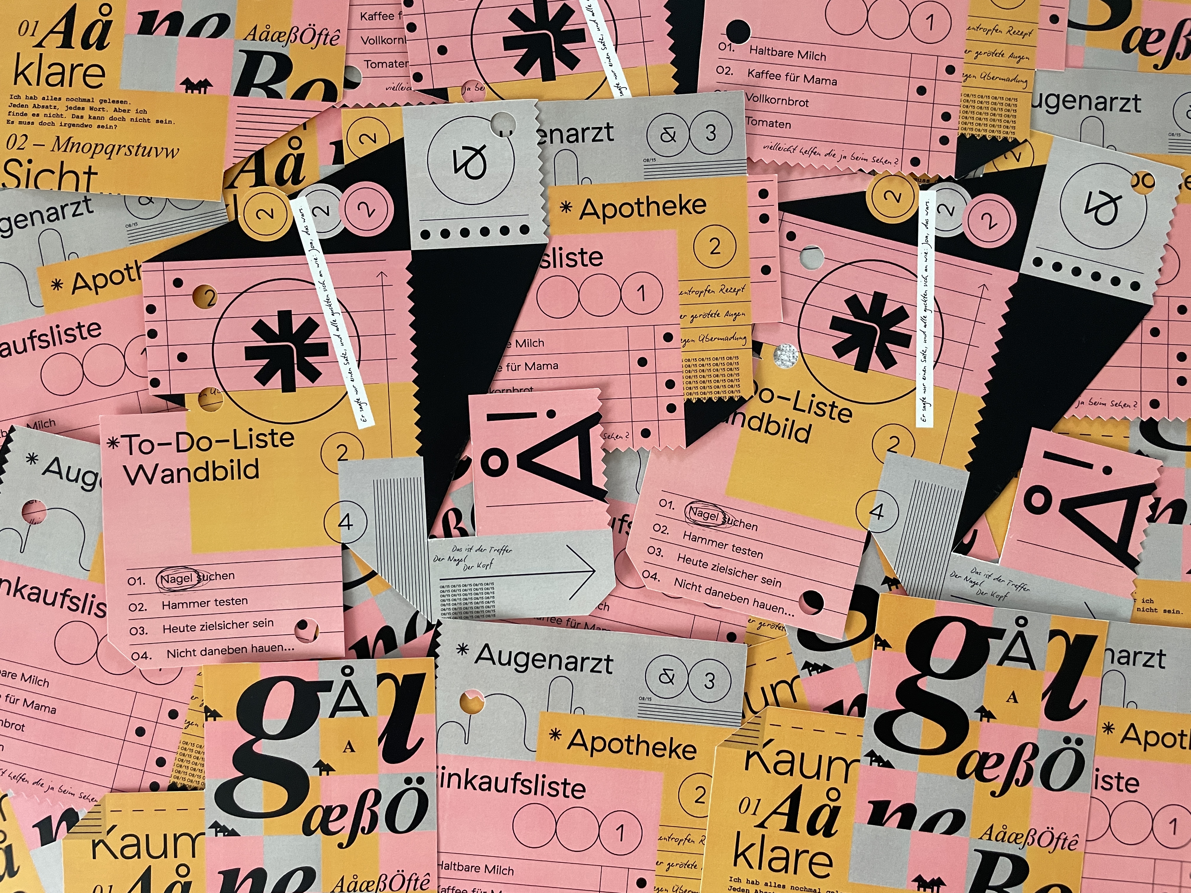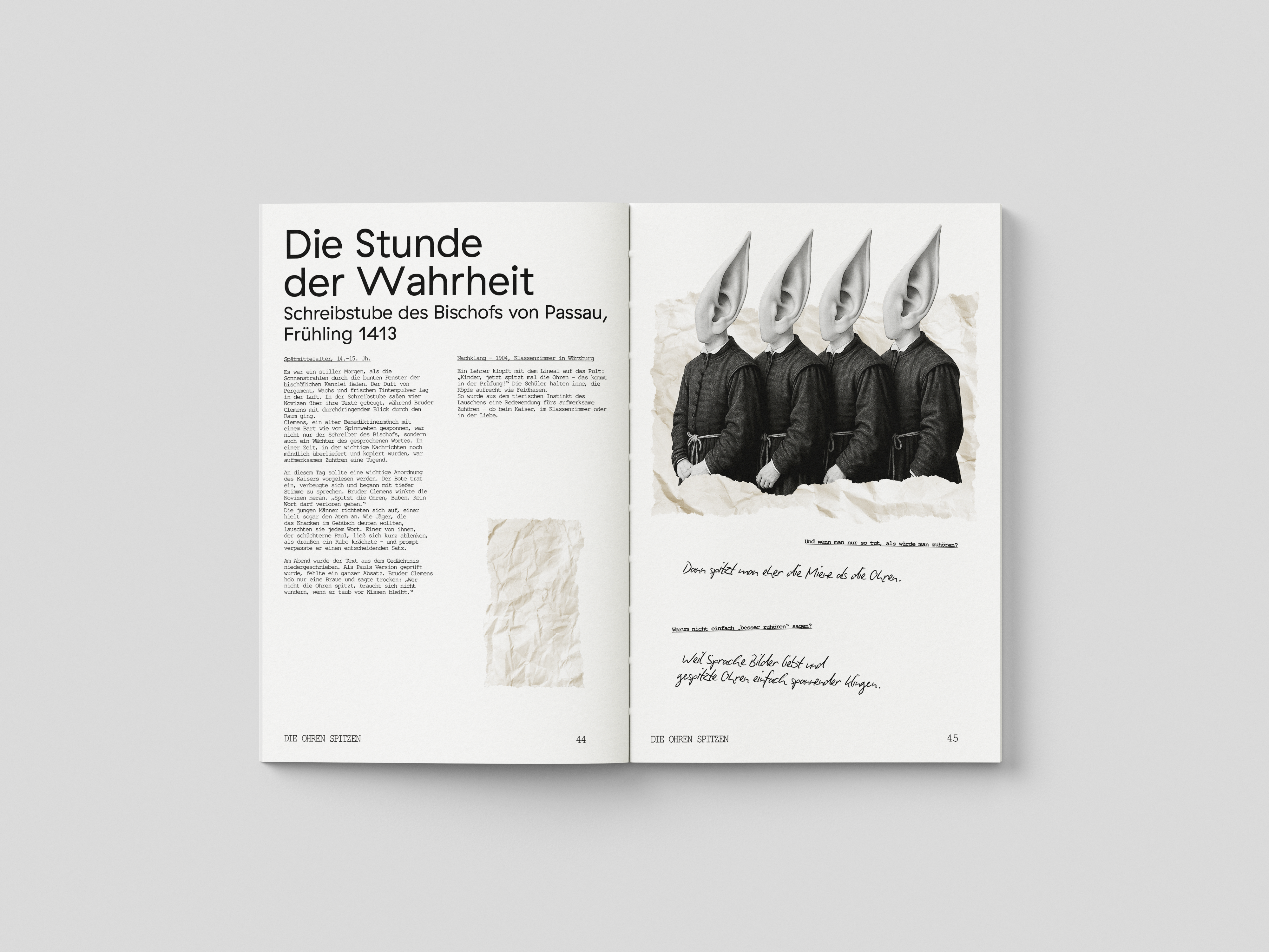 Gestalterisch entschieden wir uns für ein großzügiges DIN A4-Format, eine offene Fadenheftung in Schweizer Broschur und ein durchdachtes typografisches Konzept mit drei komplementären Schriftsystemen. Farbakzente in Pink, Gelb und Oat strukturieren das Editorial und weisen auf interaktive Inhalte hin. Ergänzt wird es durch Lesezeichen und Rätselkarten, die als physische Lern- und Spielimpulse dienen.