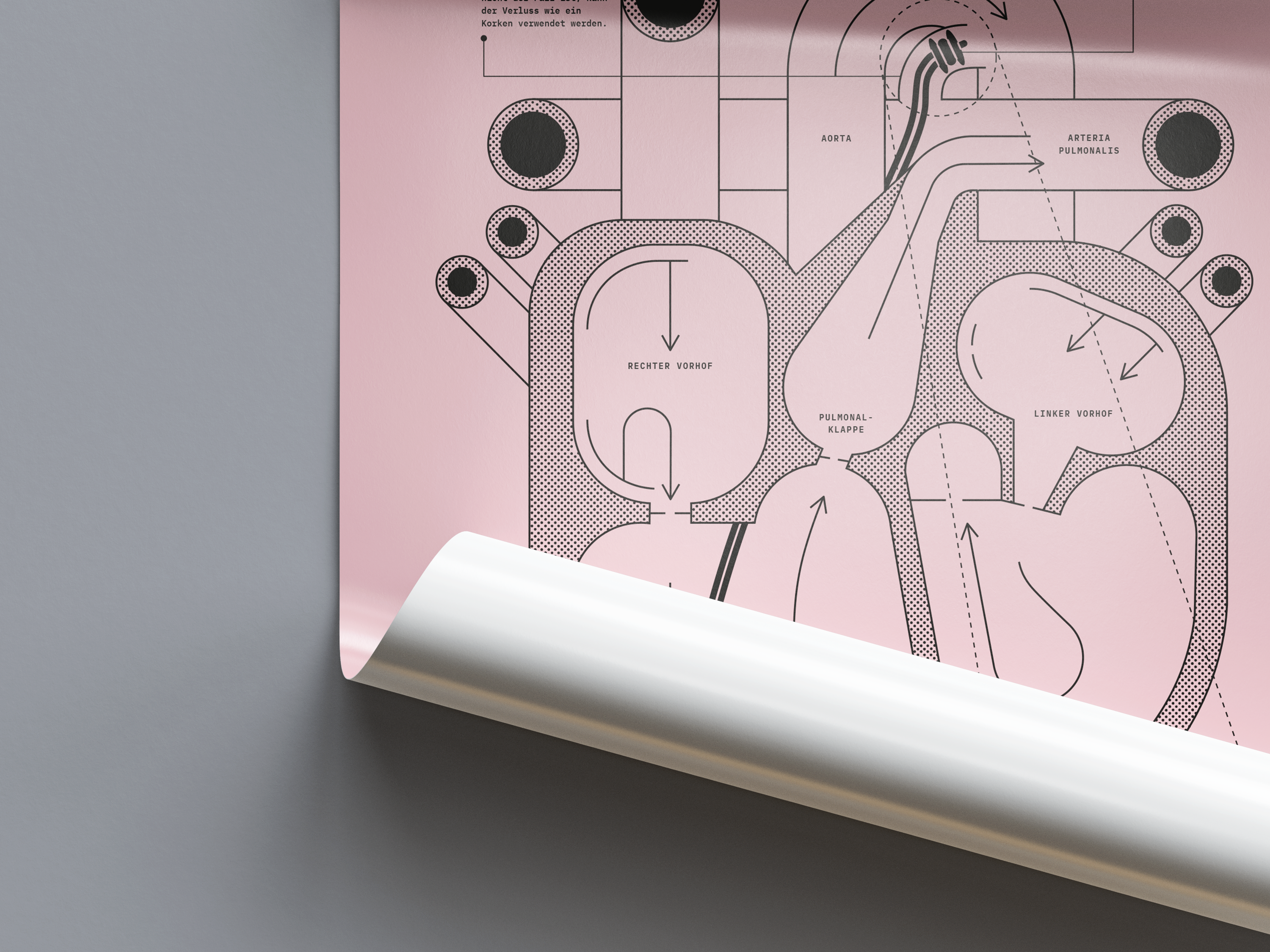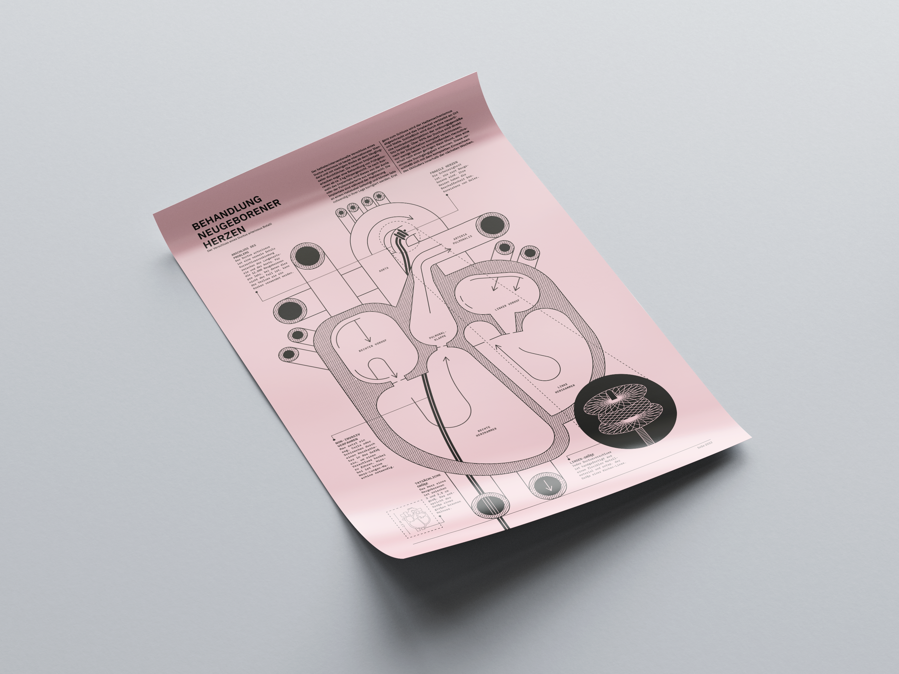 Ein Poster, das den Eingriff am Ductus arteriosus Botalli erklärt. Klingt nach lateinischem Zauberspruch, ist aber eine hochkomplexe Prozedur, die ich in ein visuelles System übersetzt habe. Ergebnis: Ein Mix aus klarer Typografie, schematischer Darstellung und einem Hauch U-Bahn-Plan fürs Blut.