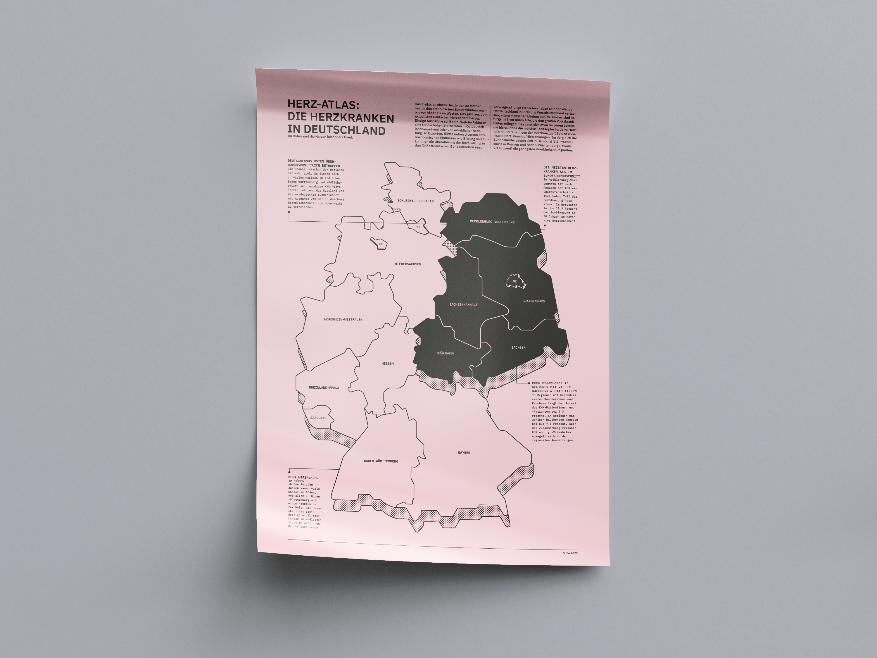 Eine Infografik, die aufzeigt, in welchen Regionen Deutschlands Herzkrankheiten am häufigsten auftreten. Spoiler: Der Osten hat statistisch gesehen die schlechteren Karten. Es geht dabei weniger um Schuldzuweisungen, sondern darum, Daten sichtbar und vergleichbar zu machen.