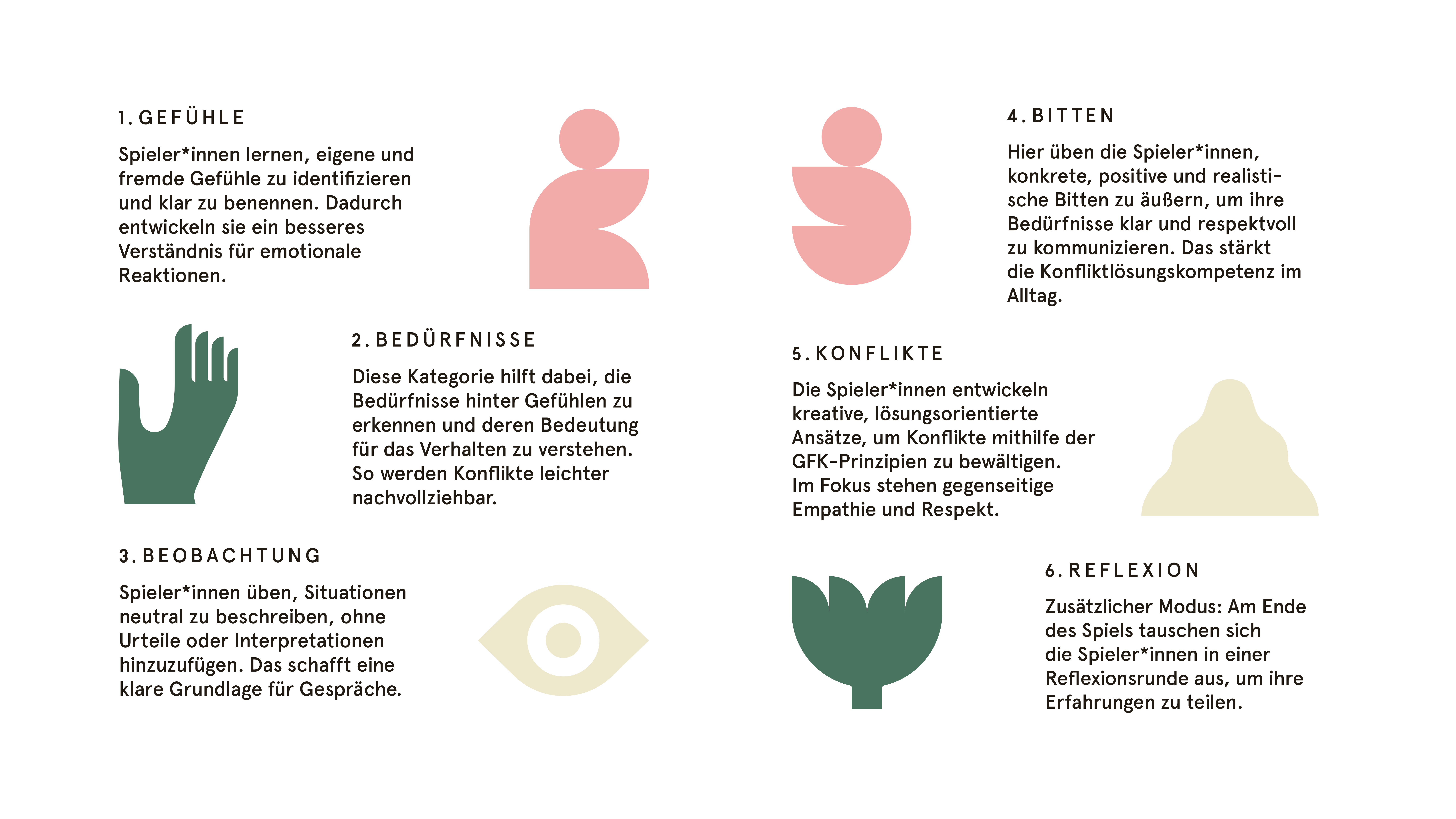 Es stand die Frage im Mittelpunkt, wie sich komplexe soziale oder psychologische Inhalte so aufbereiten lassen, dass sie für eine definierte Zielgruppe nicht nur verständlich, sondern auch attraktiv und anwendbar werden. Anhand des ausgewählten Themas Gewaltfreie Kommunikation beschäftigten wir uns mit Empathie, Gefühlen, Bedürfnissen und Konflikten – und wie diese theoretischen Konzepte in eine greifbare, spielerische Form übersetzt werden können.